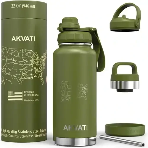AKVATI 32 oz Insulated Stainless Steel Water Bottle with 3 Lids