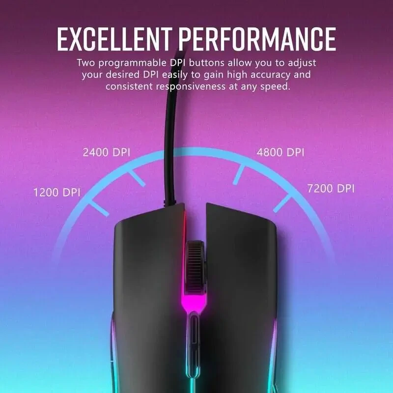 The single most important feature for a competitive gamer is the ability to adjust sensor sensitivity instantly. The GM300's dedicated DPI button is the key to this. One moment, you can be on a high DPI setting for fast, 360-degree turns in a close-quarters battle. The next moment, you can press the button to drop to a low DPI, steadying your aim for a critical long-range sniper shot. It's a feature found on elite, professional-grade mice, and it's here on the GM300. Combined with a comfortable, ergonomic shell that fits naturally in your hand and vibrant RGB lighting to complete your setup, this mouse is a serious upgrade that will translate to real in-game performance.