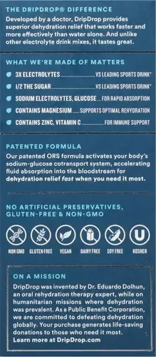 Developed by a doctor, Drip Drop's patented formula is a game-changer. It’s an Oral Rehydration Solution (ORS) that provides faster, more effective hydration than water or sports drinks. Here’s why it’s your best choice.