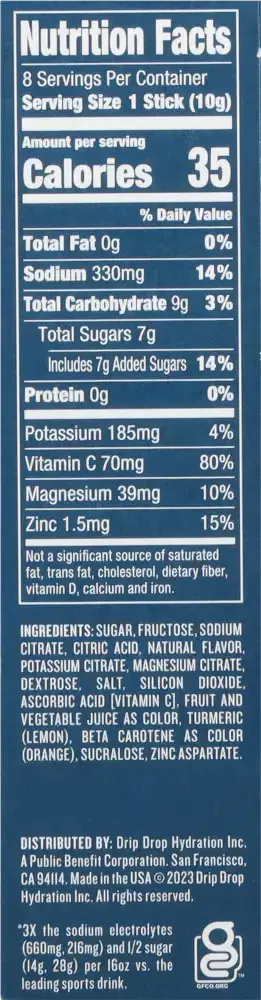 Drip Drop is an Oral Rehydration Solution (ORS) with a patented, medically-proven ratio of electrolytes. It contains about 3x the electrolytes and half the sugar of typical sports drinks, leading to significantly faster and more effective hydration.