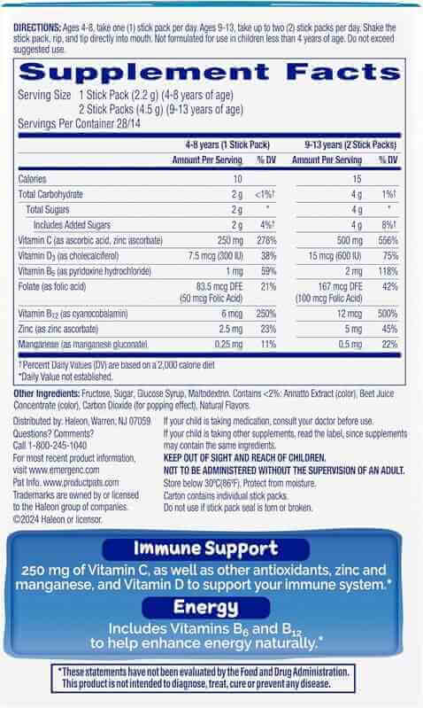 It's straightforward and fun: Simply rip open a stick pack, tip the crystals onto your child's tongue, and let them enjoy the fizzy pop! Recommended for kids ages 4 and up, take one packet daily with or without food. For optimal immune support, pair it with a balanced diet and good hygiene. Pro tip from my experience: Use it as a morning routine to start the day energized.