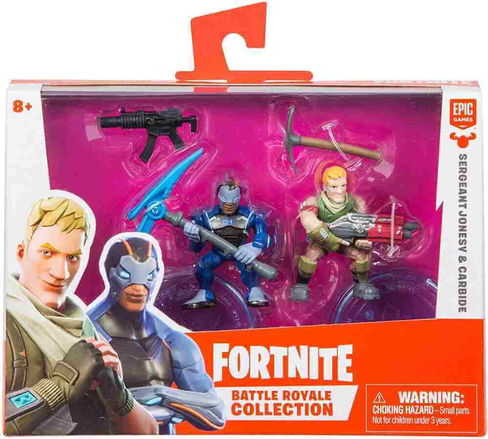 This pack includes two 2-inch Fortnite action figures: Carbide and Sergeant Jonesy. It also comes with two display stands and four swappable accessories.