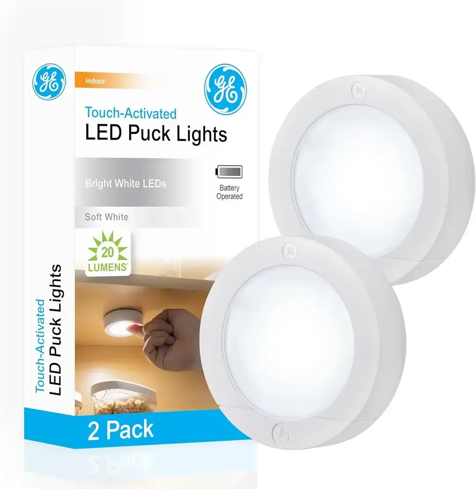 [](https://www.lightdecor.net/product/20060/ge-wireless-battery-operated-20-lumens-touch-activated-on-off-bright-white-ideal-for-closets-cabinets-attic-garage-and-more-25434-2-pack-led-puck-lights-2-count)[](https://www.homedepot.com/p/GE-Touch-Activated-White-LED-Puck-Light-2-Pack-25434/300243029)