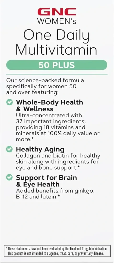 Disclaimer: Product images are for illustrative purposes. Slight variations in color or packaging may occur. GNC One Daily Multivitamin 50 Plus is sold by More4Less, an independent retailer. Always read labels, warnings, and directions provided with the product before using or consuming it.