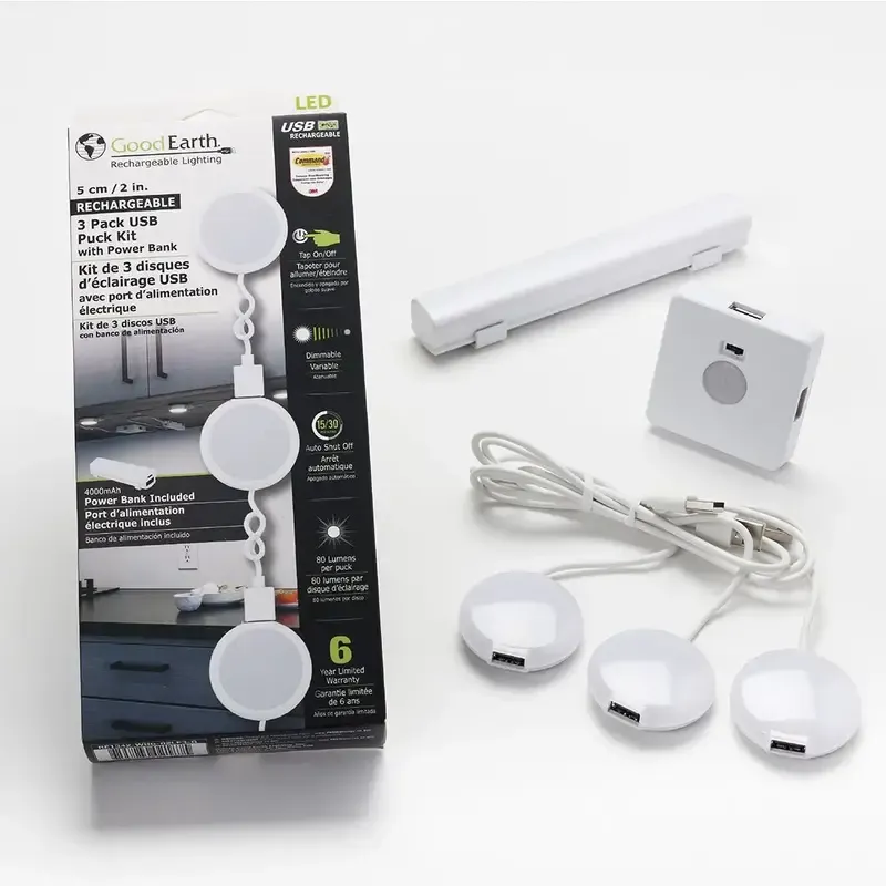 Good Earth 3-Pack 2-in Rechargeable USB LED Puck Light Kit with Power Bank