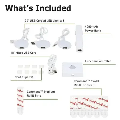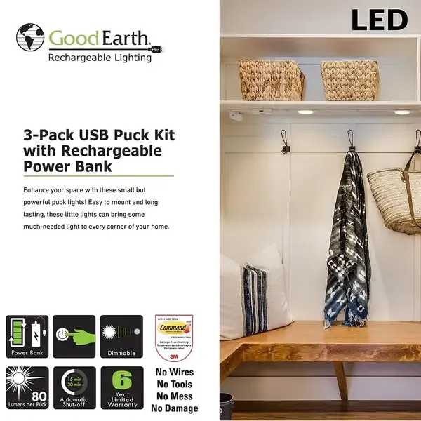Here’s what sets these puck lights apart: - **Rechargeable via USB:** Plug into the included power bank—no batteries needed. - **Dimmable to 10%:** Adjust brightness with a touch for the perfect ambiance. - **Auto-Off Timer:** Set to 15 or 30 minutes to save power. - **Easy Installation:** Command™ Strips make mounting a snap—no damage, no fuss. - **Linkable Design:** Control all three lights from one power source. - **Trusted Quality:** Comes with a 6-year limited warranty.