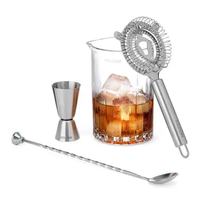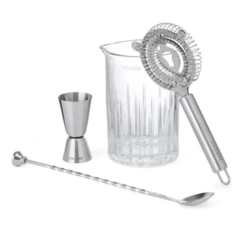 Why choose Houdini over other bar tool sets? Unlike generic 4-piece sets priced at $35–$40 with plastic components, Houdini offers premium stainless steel and glass at just $29.99. Compared to brands like True or Oggi, Houdini’s mixing glass and long-handled spoon provide better control for stirred cocktails. Plus, More4Less includes free shipping, unlike Amazon’s Prime-only deals. This set is a better value for home bartenders seeking quality without breaking the bank.