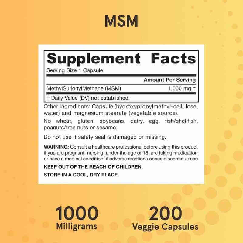 Jarrow Formulas MSM supports joint health, cartilage formation, and skin vitality by providing bioavailable sulfur, essential for collagen production.