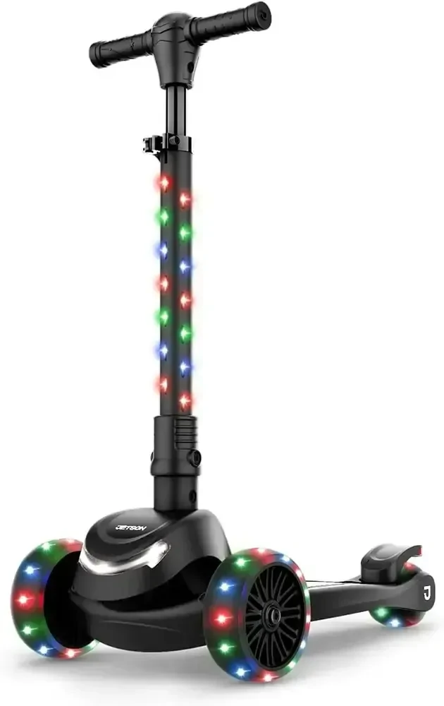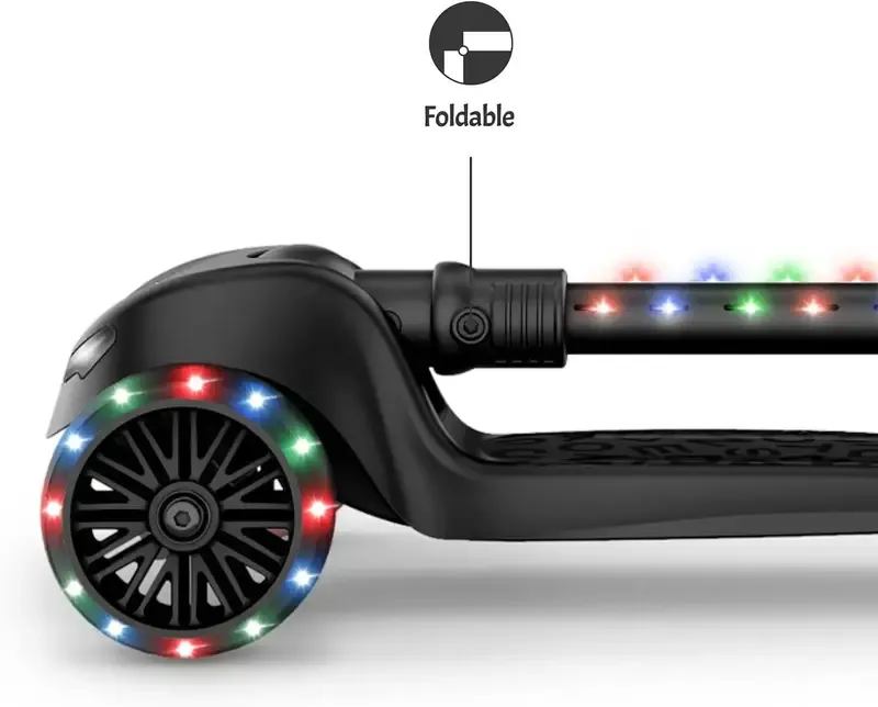 Key Features | LED light-up wheels and stem, adjustable handlebar (29”–34”), 3-wheel stability, rear foot brake, 132-lb weight limit, 6-lb lightweight frame, easy-folding |