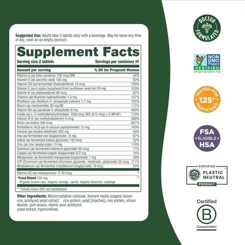 Key Features | Choline, methylated folate, iron, vitamin B6, vitamin D3, non-GMO, gluten-free, vegetarian |
