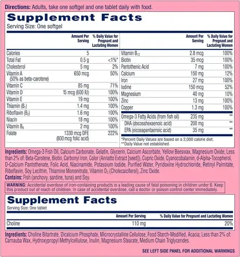 This advanced formula separates nutrients for better stability and absorption. The tablet contains your daily multivitamin, including key minerals like Folic Acid and Iron. The softgel contains Choline and plant-sourced DHA, an Omega-3 fatty acid, which are crucial for brain and eye development.