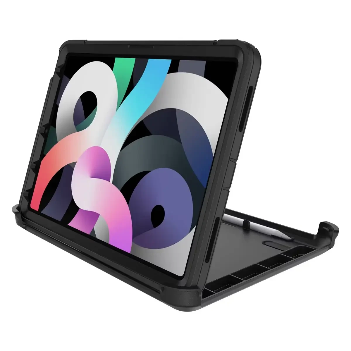 The black OtterBox Defender Series Case for the Apple iPad Air (4th and 5th Generation), including the shield stand. A rugged, multi-layer case providing heavy-duty drop, dust, and scratch protection for an iPad Air. OtterBox Defender Series Case for iPad Air (4th & 5th Gen) - Black