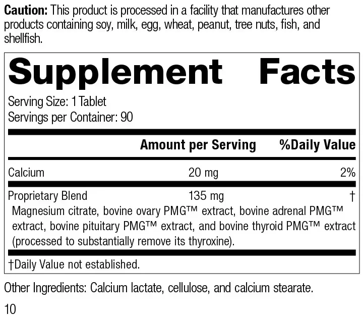 - Protomorphogen™ Blend: 135 mg of bovine ovary, adrenal, pituitary, and thyroid PMG™ extracts per tablet.