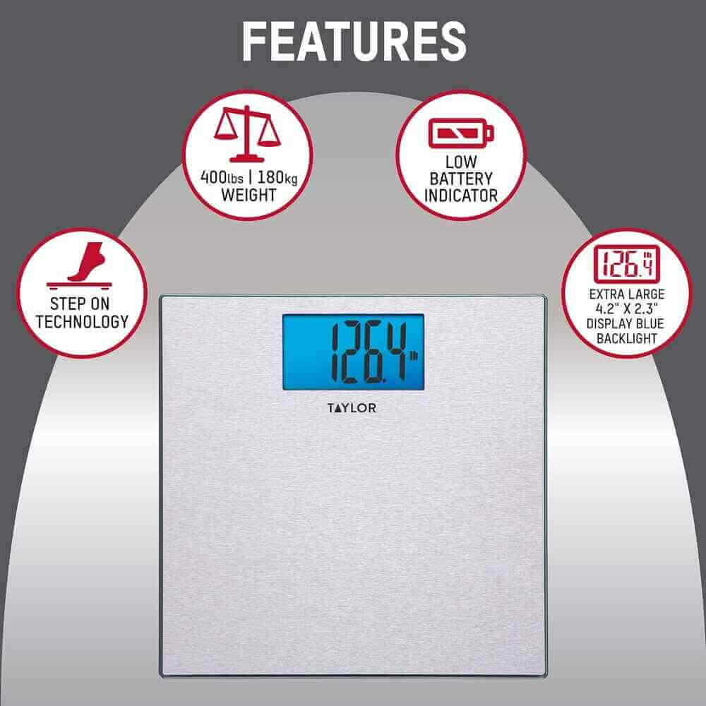 The Taylor Digital Body Scale is engineered for performance, inside and out. It uses instant-on technology—just step on the platform and get your weight instantly. The oversized, high-contrast LCD display is easy to read from a distance. And the beautiful brushed stainless steel platform not only adds a touch of modern elegance to your bathroom but is also durable and easy to clean.