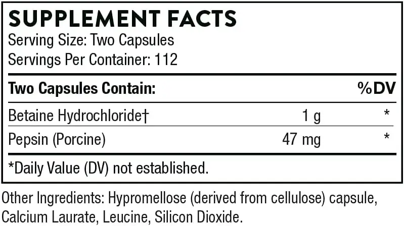 - Ingredients: Betaine HCL, Pepsin, Hypromellose (Capsule), Silicon Dioxide
