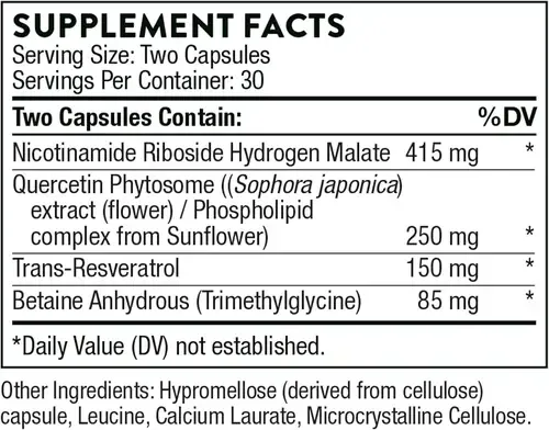 - Key Ingredients: Nicotinamide Riboside (NR), Resveratrol, Quercetin, Betaine