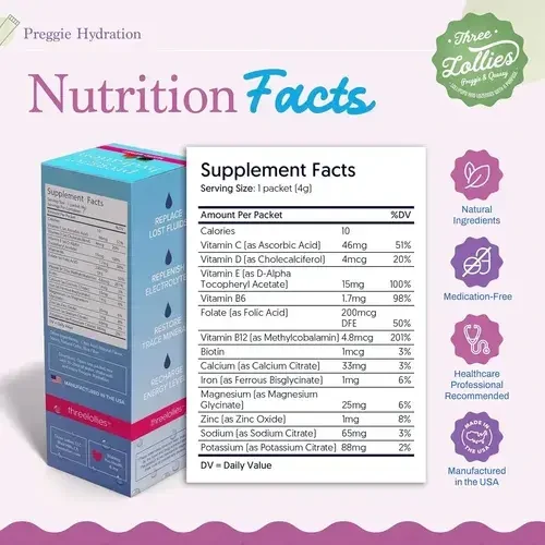 Each packet of Three Lollies Preggie Mix Berry Hydration is formulated with a carefully selected blend of vitamins and minerals to support the needs of pregnant women. These include B-complex vitamins, vitamin C, and electrolytes - all of which play a vital role in maintaining energy levels, supporting fetal development, and promoting overall maternal health.