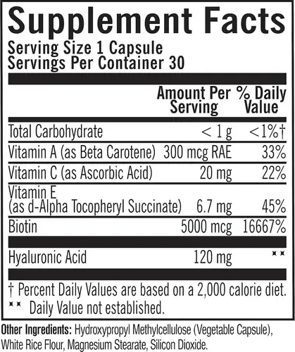 Key Features | Biotin, hyaluronic acid, antioxidant blend, gluten-free |