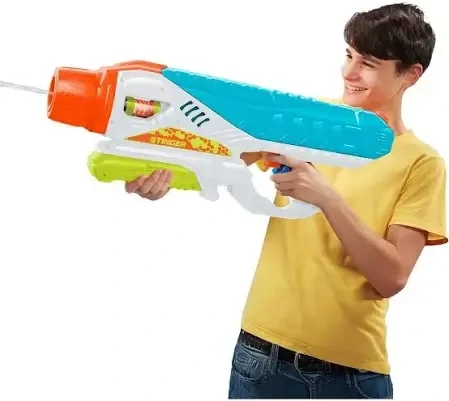 The Water Warriors Stinger blaster is engineered for distance and can blast water up to an impressive 38 feet under optimal conditions.